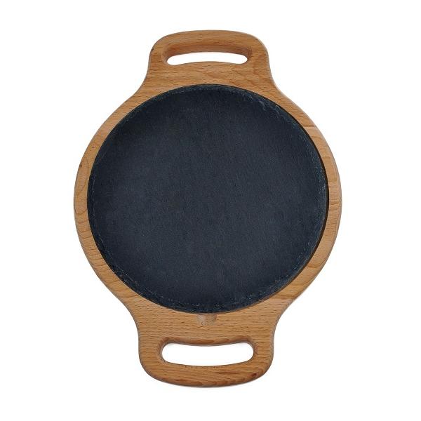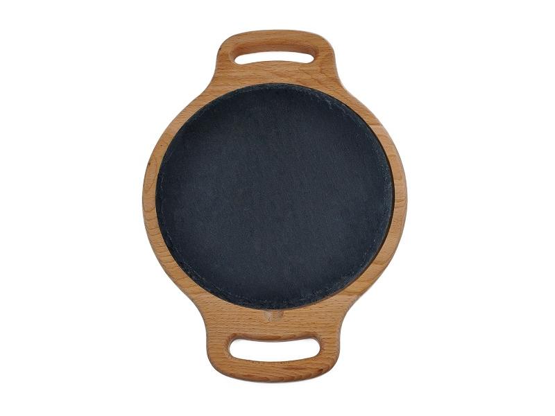 Блюдо для подачи круглое d=20 см. h=1,5 см. черное, сланец, на дерев. подставке с ручками /1/ АКЦИЯ