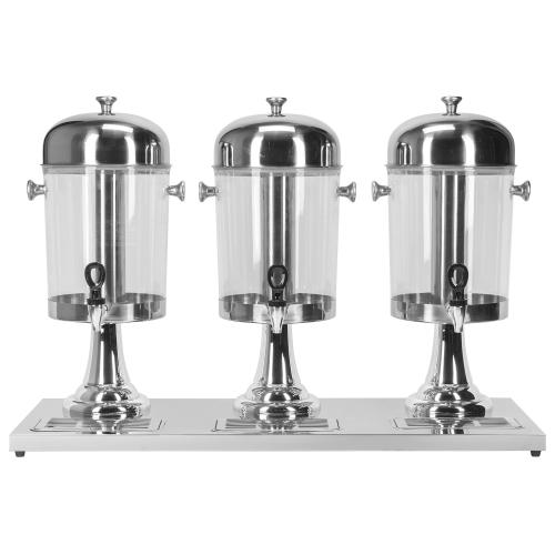 Диспенсер для соков и холодных напитков с тремя емкостями по 8 л каждая. Высота 56 см, общая длина 85 см. Колбы из пищевого полиэтилена, основание, крышки, поддон и контейнер для льда из нержавеющей стали. Оснащен качественными кранами с уплотнителями и поддонами для сбора капель. Идеальное решение для кафе, ресторанов и мероприятий — удобно, гигиенично и стильно.