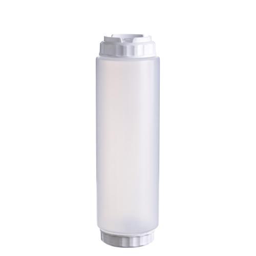 Емкость для соуса 1000 мл выполнена из прочного пищевого пластика и предназначена для профессионального использования в сегменте HoReCa. Конструкция имеет две откручивающиеся крышки и съемный силиконовый клапан, что обеспечивает удобство наполнения, использования и ухода, а также позволяет дозировать содержимое без подтеков и экономит место для хранения. Белый цвет служит маркировкой для майонеза и других белых соусов. Прозрачный корпус облегчает визуальный контроль содержимого. Подходит для мытья в посудомоечной машине.