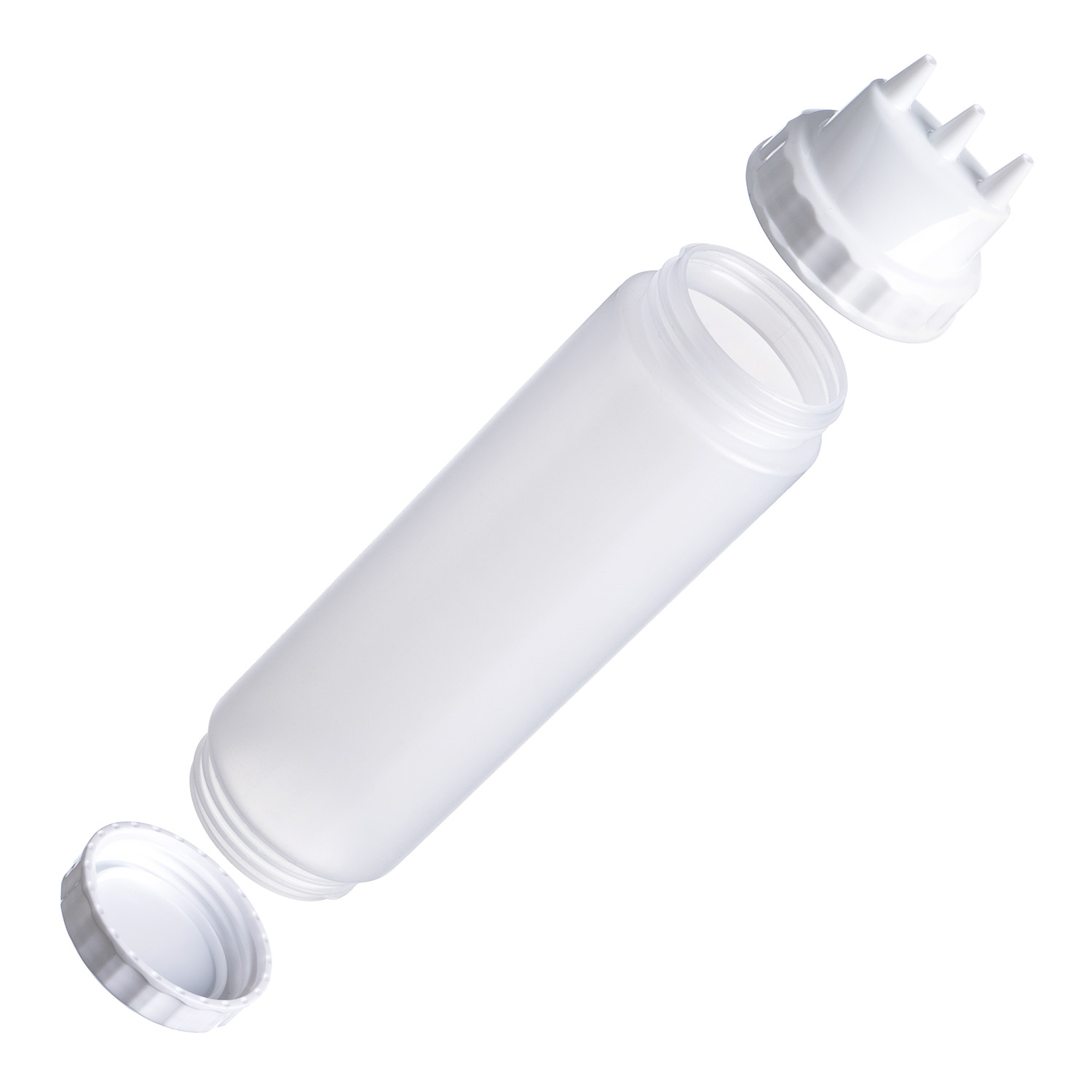 Емкость для соуса 750 мл выполнена из прочного пищевого пластика и предназначена для профессионального использования в сегменте HoReCa. Конструкция с двумя откручивающимися крышками обеспечивает удобство наполнения, использования и ухода. Тройной дозирующий носик позволяет быстро и точно распределять содержимое. Белый цвет служит маркировкой для майонеза и других белых соусов. Прозрачный корпус облегчает визуальный контроль содержимого. Подходит для мытья в посудомоечной машине.