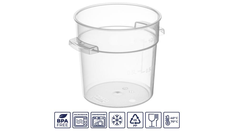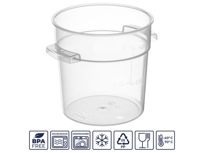 Контейнер для продуктов круглый 0,95 л. d=13 см. h=11 см., с мерной шкалой, прозрачный, п/п, без крышки (крышка 76728, 76727, 76726, 76729) GP /1/24/