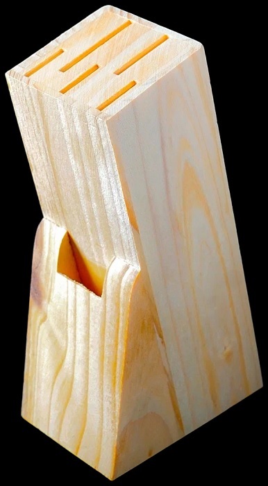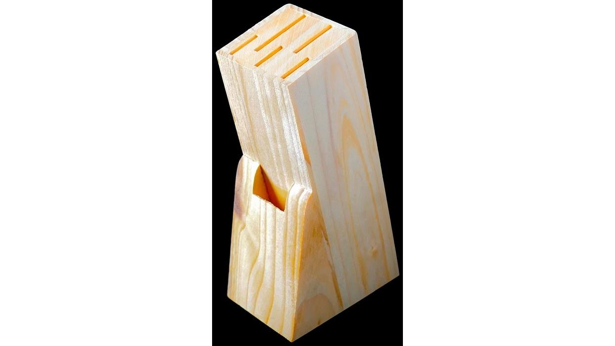 Подставка для ножей изготовлена из сосны и нержавеющей стали.
