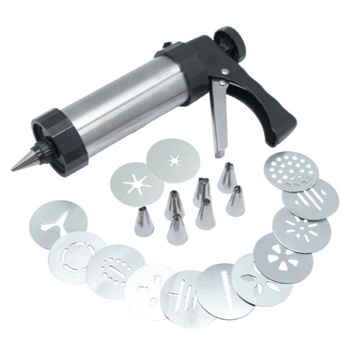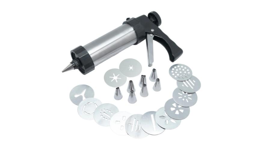 Шприц кондитерский с комплектом из 8 насадок (нерж.) и 13 формирующих дисков (алюм.). Предназначен для порционной подачи теста, крема, муссов.