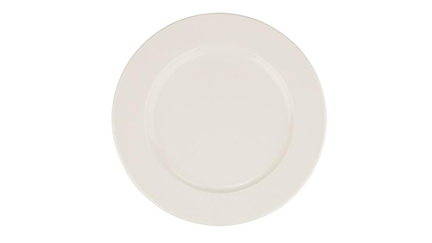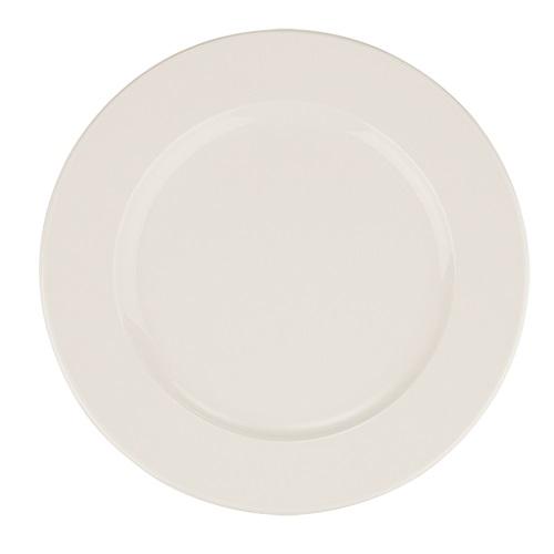 Тарелка белого цвета со сливочным оттенком.