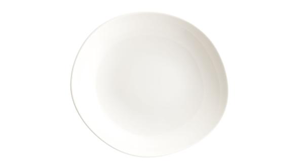 Тарелка белого цвета со сливочным оттенком.