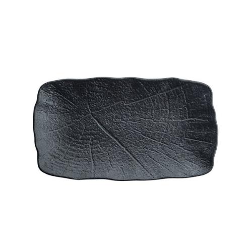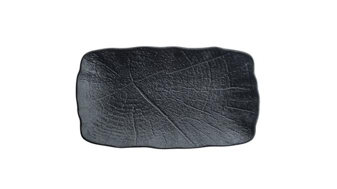 Блюдо для подачи насыщенного черного цвета со стилизацией поверхности под рисунок листьев лотоса.