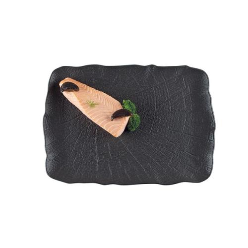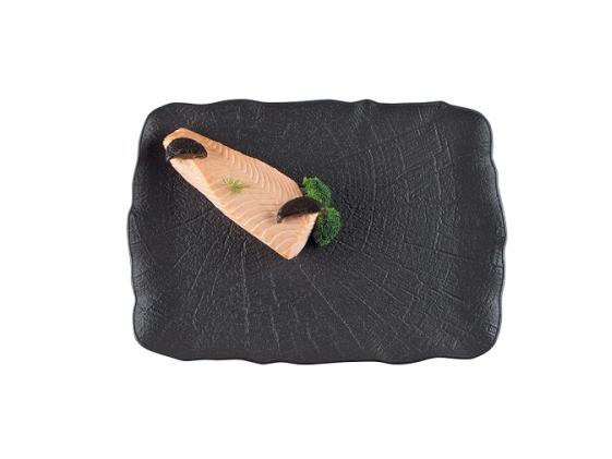 Блюдо для подачи насыщенного черного цвета со стилизацией поверхности под рисунок листьев лотоса.