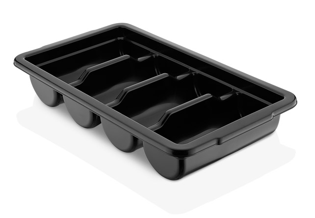 Емкость для столовых приборов (53*29*9,5 см) из полипропилена на 4 секции. Удобные ручки обеспечивают надежный хват. Возможность штабелирования экономит место при хранении. Подходит для мытья в посудомоечной машине.