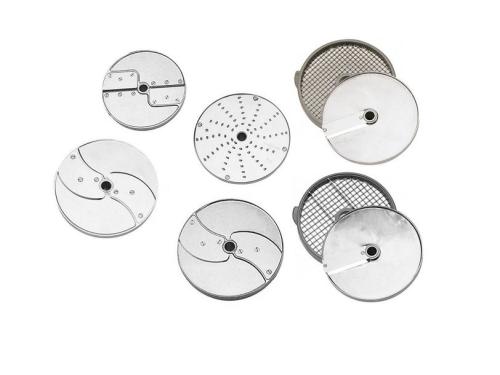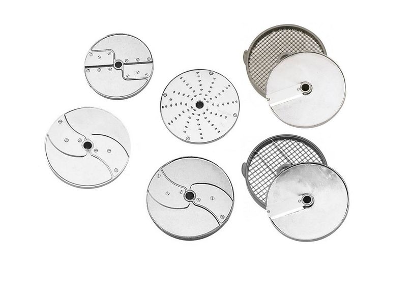 Комплект 8 дисков для R 502, CL 50 / CL 50 Ultra, CL 52: слайсер 2 мм (капуста, огурцы, лук) и 5 мм, терка 2 мм (морковь), соломка 3x3 мм (морковь для корейского салата), комплект для нарезки кубиками: ломтики10 мм + решетка 10x10 мм; комплект для приготовления фри 10 x 10 мм (2 диска).