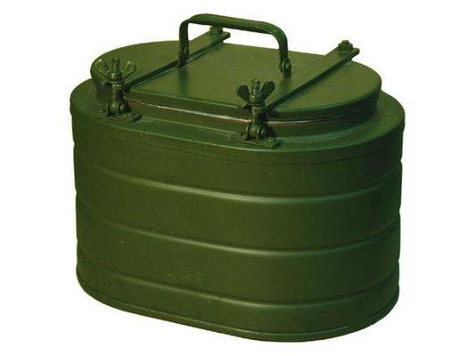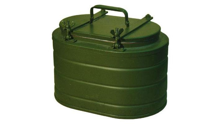 Термос походный состоит из крашеного металлического контейнера корпуса, вынимающейся нержавеющей колбы и крышки притягиваемой болтами с барашками.